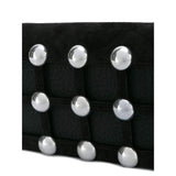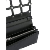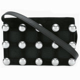 Black suede Prisma biker crossbody wallet from Alexander Wang featuring a foldover top with snap closure, silver-tone stud detailing, an interior zipped compartment, multiple interior card slots and a cage front.