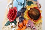 Embellishment: Silver studs, crystals, leather and textile flowers