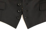 Classic black blazer featuring deep V-neck, button-down front, buttoned sleeves, buttoned tab on the backside. D&G silk blend blazer has scarf printed silk inserts to the backside. Logo details.