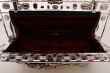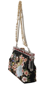 Color: Black with multicolor floral embroidery, silver metal detailing