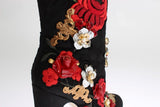 Designer Women's Black Boots Roses Crystal Brocade Heel Boots