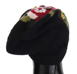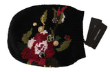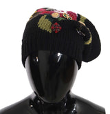 Black Wool Crystal Studded Knitted Floral Beanie Hat
