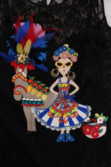Color: Black with multicolor embellishement and feathers