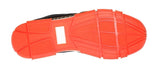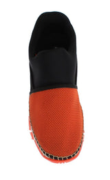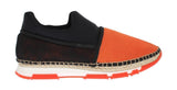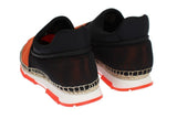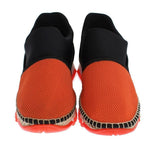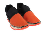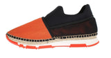 Orange and black neoprene slip on designer dress sneakers for men. High end luxury designer shoes in a comfortable dress sneaker style.