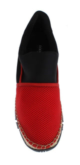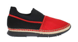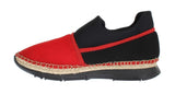 Red and black neoprene slip on designer dress sneakers for men. High end luxury designer shoes in a comfortable dress sneaker style.